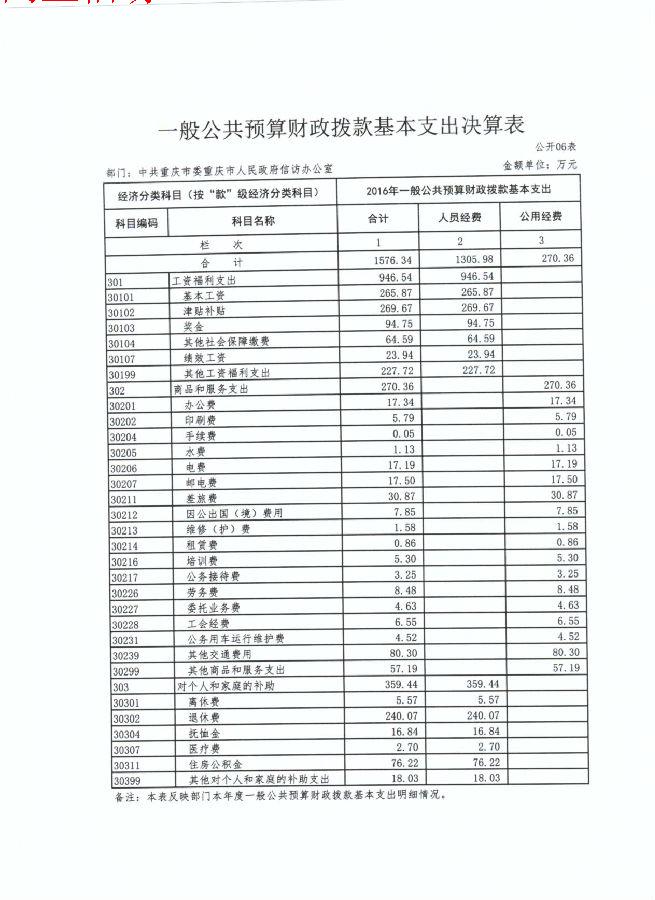 本部门2016年度一般公共财政拨款基本支出1,576.34万元。其中:人员经费1,305.98万元,较上年增加236.45万元,主要原因是人员政策性调资支出,人员经费用途主要包括基本工资、津贴补贴、奖金等;公用经费270.36万元,较上年减少110.00万元,主要原因是我办加强管理,厉行节约、严格控制各种费用开支。