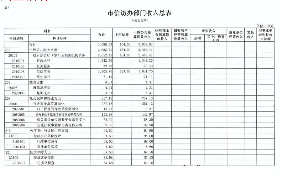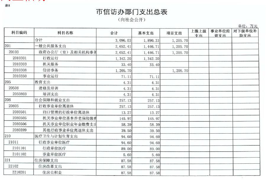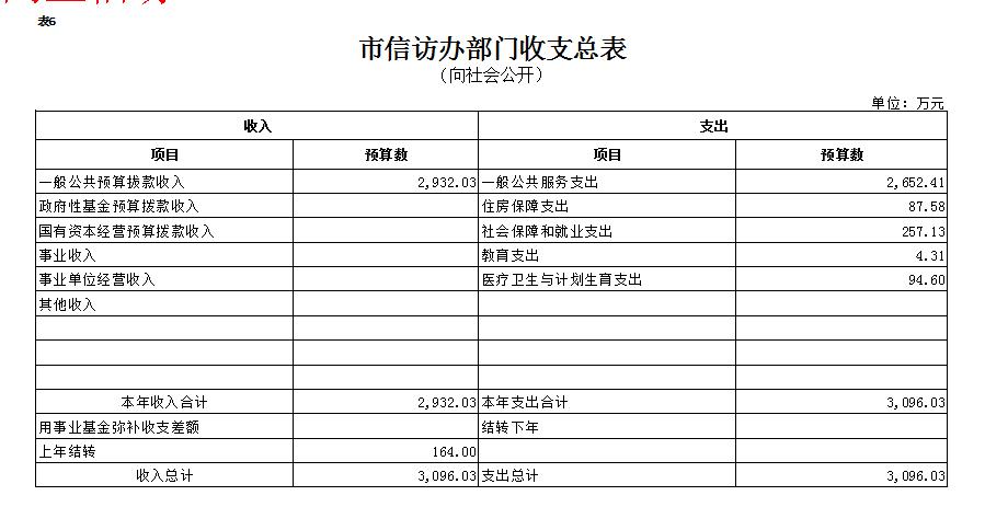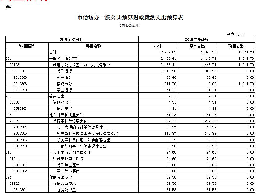 2018年一般公共预算财政拨款收入2932.03万元,一般公共预算财政拨款支出2932.03万元,比2017年增加458.70万元。其中:基本支出1890.33万元,比2017年增加313.66万元,主要原因是人员经费按政策增加。主要用于保障在职人员工资福利及社会保险缴费、离退休人员离退休费及生活补助,保障部门正常运转的各项商品服务支出;项目支出1041.7万元,比2017年增加145.04万元,主要原因是按实际情况加大了干部大下访督查、人民建议征集等工作经费投入,主要用于办理群众来信、来访中反映的污污漫画 问题,处置群体性事件,维护社会稳定。