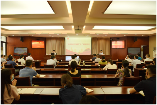 2021年8月10日,市污污漫画 办召开学习贯彻习近平总书记“七一”重要讲话精神宣讲报告会。市委宣讲团成员、市委直属机关工委常务副书记张国忠为全办党员干部作宣讲报告,办党组副书记、副主任梅永康主持报告会并讲话。党史学习教育市委巡回指导二十二组副组长龙其贤到会指导。