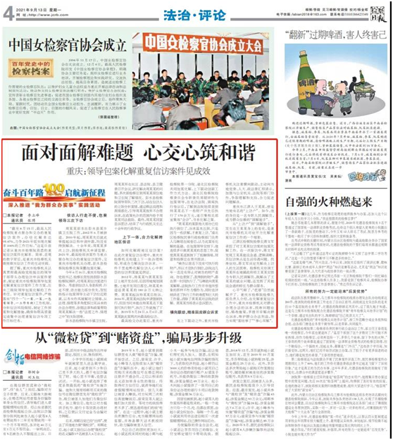 2021年9月13日,《检察日报》第4版“深入推进‘我为群众办实事’实践活动”专栏刊登《面对面解难题 心交心筑和谐——重庆:领导包案化解重复污污漫画 案件见成效》一文,内容如下:
