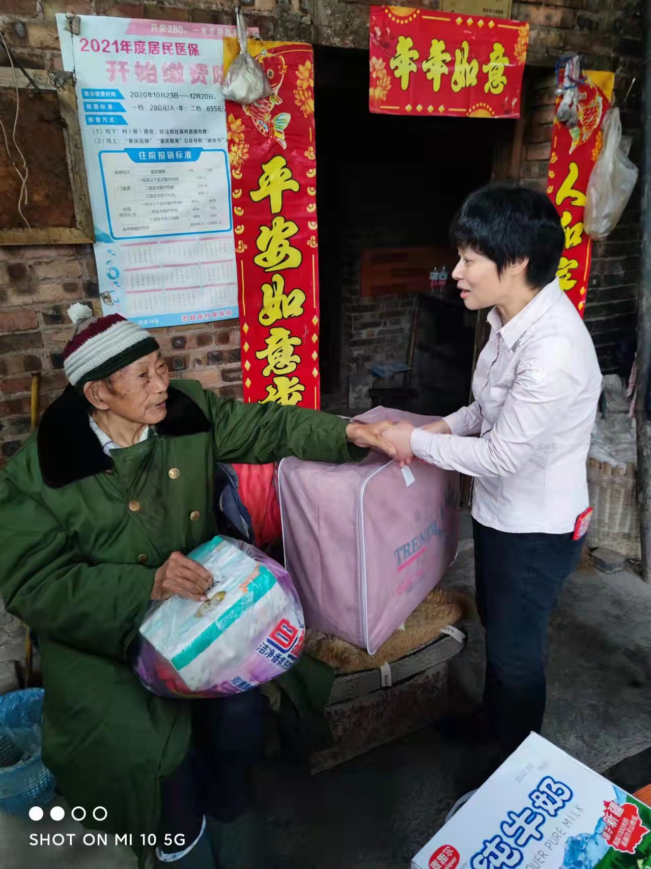 恰逢重阳佳节,党员干部上门走访慰问了白河村6户生活困难老党员、抗美援朝老战士和困难群众,给他们送去了棉被、牛奶、洗衣粉、餐巾纸等日常生活用品,与他们拉家常,宣传乡村人居环境整治相关政策,帮助打扫院坝和室内卫生。