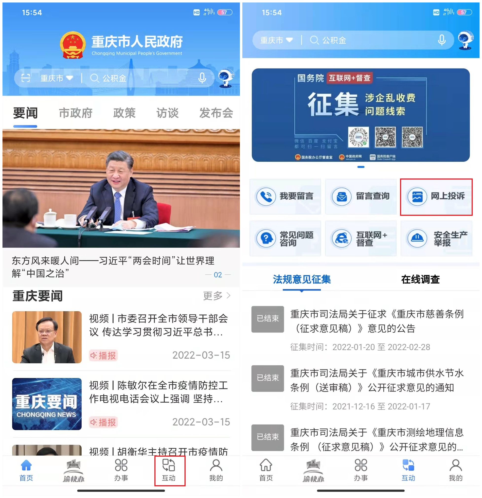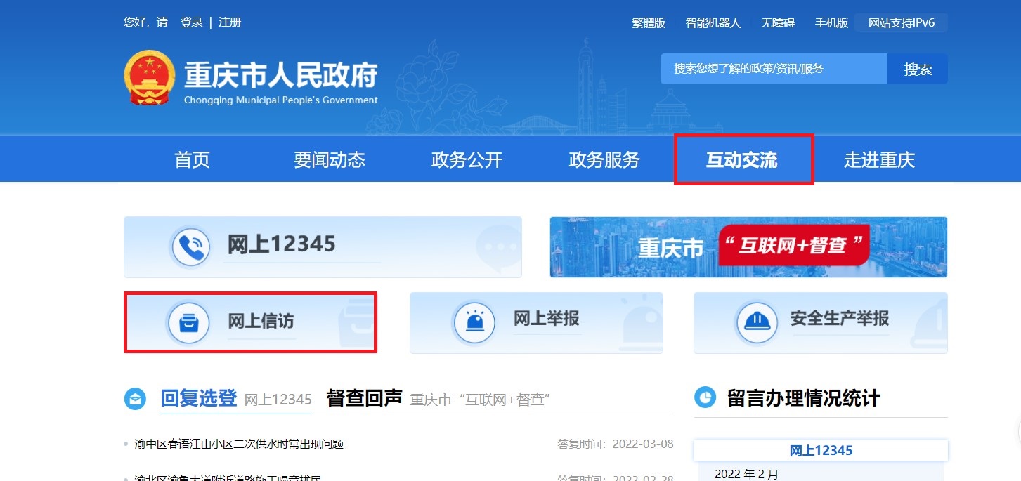 (三)在任意安卓或苹果应用市场下载“重庆市政府”渝快办APP,点开下方“互动”栏目,进入“网上投诉”进行网上污污漫画 ,或电脑登录重庆市人民政府门户网站,点开“互动交流”栏目,点击“网上污污漫画 ”进入。